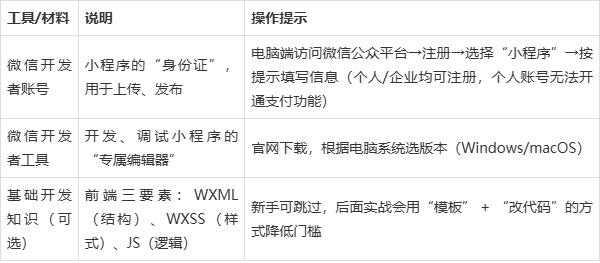 开发小程序不需要你会“建服务器”“写复杂后端代码”(后面会教你用“云开发”偷懒),但这几样工具必须提前准备: